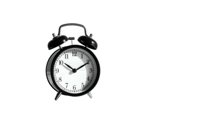 A black retro alarm clock against a stark black background, hands pointing at nearly 10 o'clock