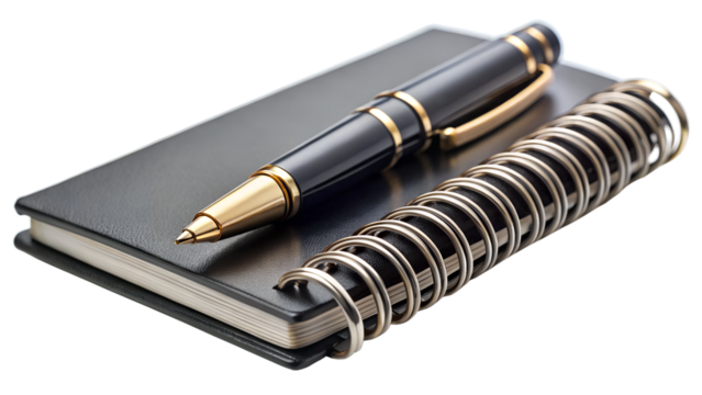 Elegant black pen resting on a notebook with a spiral binding isolated on transparent background, symbolizing writing and organization