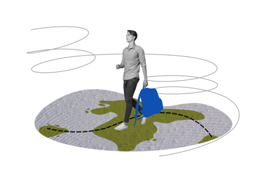 Composite artwork collage image picture of black white effect guy walk backpack world map isolated on creative background