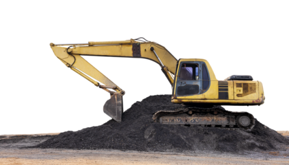 The Mighty Beast: A Yellow and Black Excavator Claiming Its Throne on a Mountain of Earth on White or PNG Transparent Background.