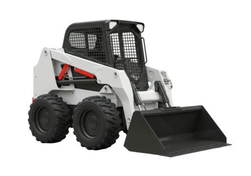 Isolated White Skid-Steer Loader with Black Bucket, Safety Cage, and Rugged Tires, Designed for Construction, Agriculture, and Landscaping Projects