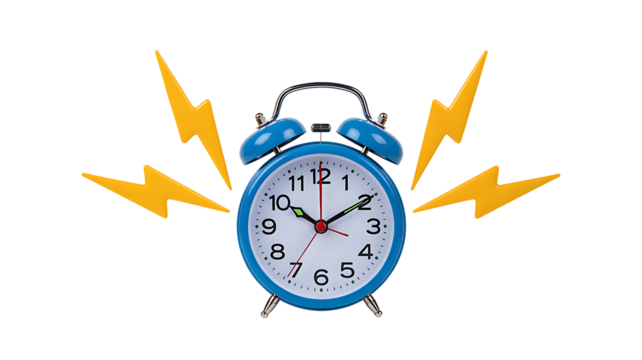 Blue alarm clock with yellow lightning bolts on transparent background time