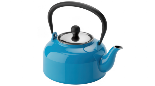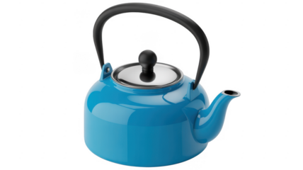 Blue shiny kettle with black handle and lid blue kettle isolated on a transparent background