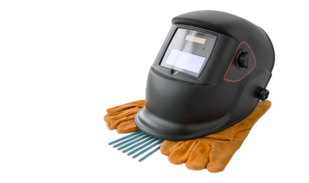 welding helmet with electrodes and gloves