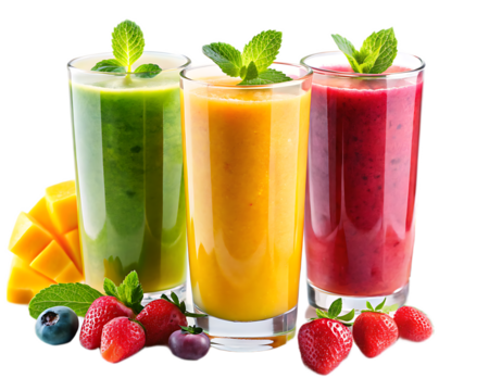 Three glasses of colorful smoothies with fruit and mint leaves on a black background isolated shot