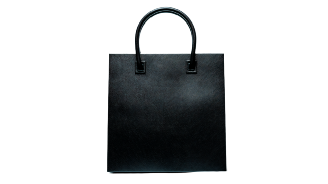 A brown and black dog on a leash next to a black bag being held in hand on a white background
