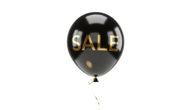Glossy black balloon with golden SALE text isolated PNG, elegant promotional graphic element on transparent background for marketing campaigns