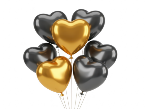 Bunch of shiny black and gold heart shaped balloons on transparent background
