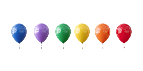 Floating colorful balloons on transparent background in a straight line