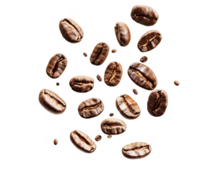 Floating roasted coffee beans against a dark transparent background depicting freshness and aromatic flavor