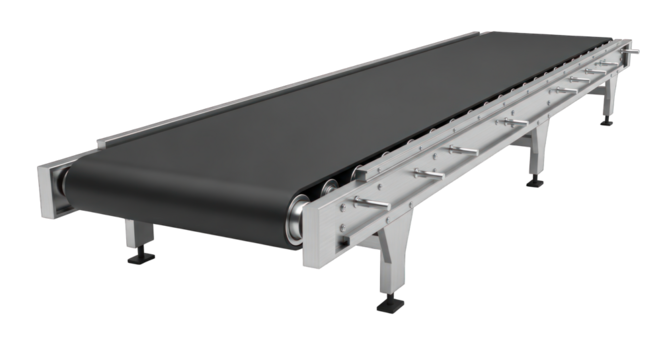 Industrial Conveyor Belt System with Metal Frame and Black Belt.