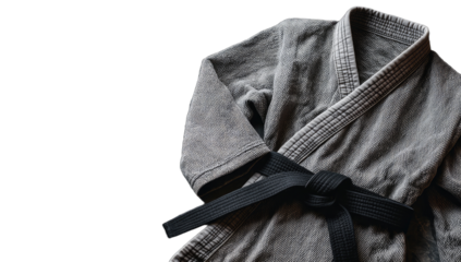 A grey martial arts uniform with a black belt tied around its waist