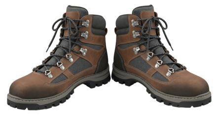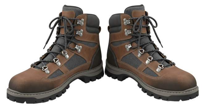 Pair of rugged brown leather hiking boots with black laces and metal eyelets isolated on transparent background