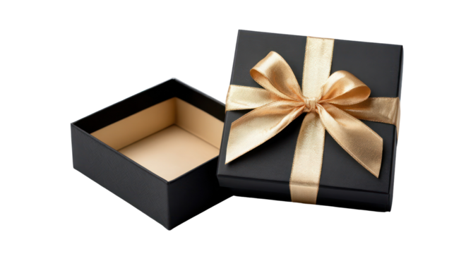 Open black box mockup isolated for product packaging and gifts on transparent background