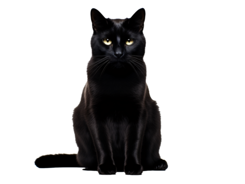 A witches black cat with glowing eyes sitting calmly isolated on a plain white background
