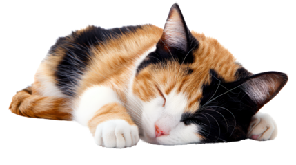 black, orange and white calico cat sleeping, tranparent, isolated background png