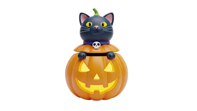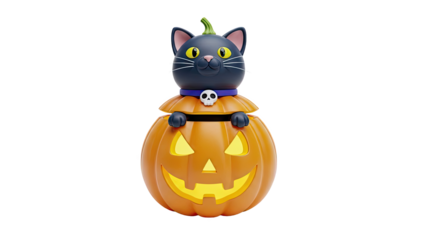 Halloween pumpkin with black cat and witch hat isolated on transparent background
