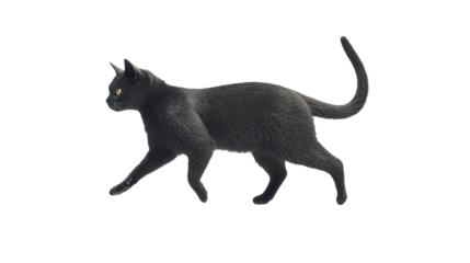 A black cat walking confidently, isolated on a white background. Its bright eyes and fluffy tail add to its charming