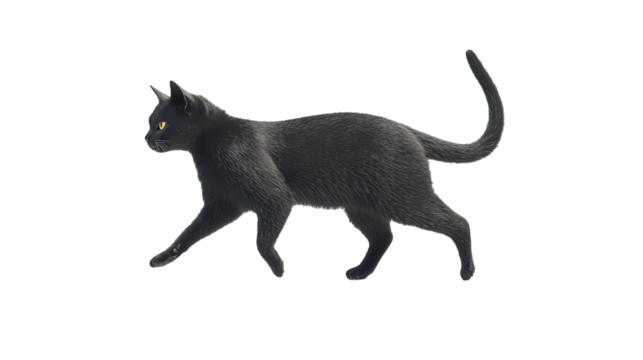 Sleek, short-haired adult black cat with glossy ebony fur, bright amber-yellow eyes, and tail held high, walking gracefully on a pristine transparent studio background with negative space, concept