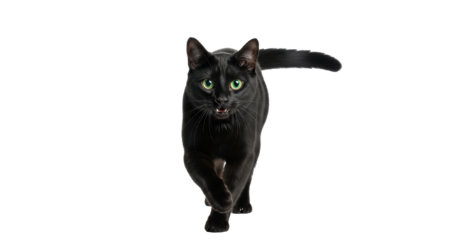 Isolated Black Cat Walking Forward with Tail Raised, Showing Teeth, Green Eyes Staring