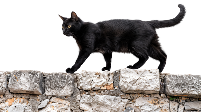 Sleek Black Cat Walking on a Rustic Stone Wall on Transparent Background, Perfect for Animal and Nature Designs