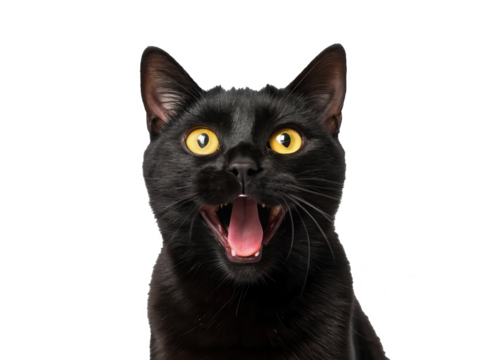A strikingly expressive black domestic shorthair cat with intensely focused golden eyes and long white whiskers is captured in a portrait-style photograph,, isolated on transparent background.