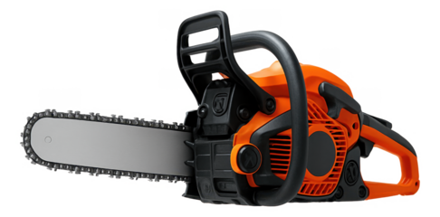 Orange chainsaw with black accents and silver blade isolated on transparent background displayed at an angle
