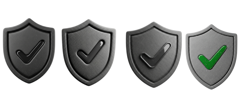 Set of 3D metallic security shields with checkmark icons for protection and validation.