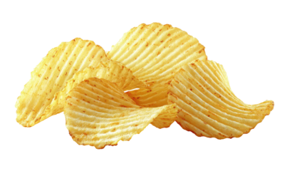 Crispy golden potato chips spill from a rustic burlap sack, isolated on black