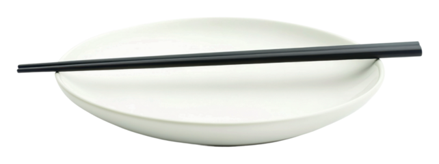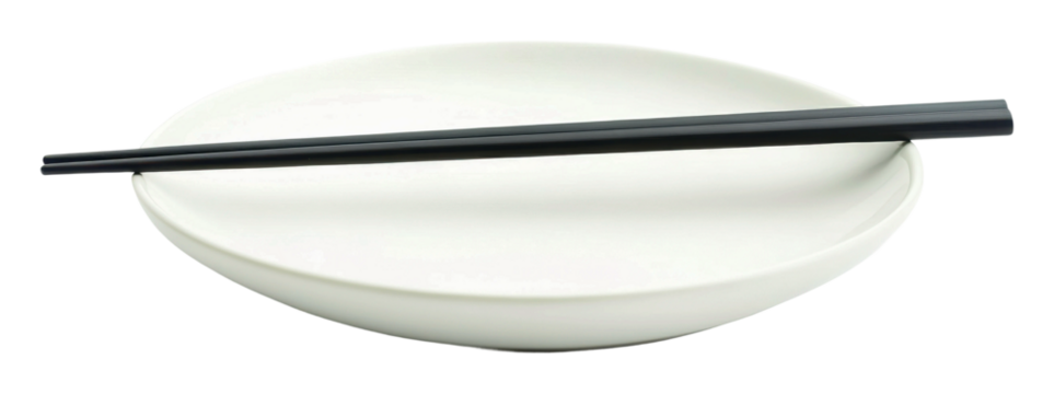 Simple white plate with black chopsticks resting, cut out - stock png.