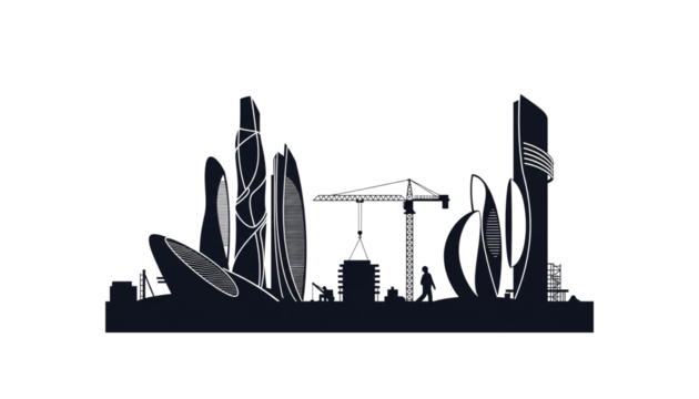 Modern city skyline featuring various skyscrapers against a stark black backdrop on transparent background
