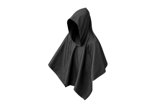 A dark, mysterious black hooded cloak or cape, rendered against a solid background, evoking themes of fantasy, mystery, and shadow. background removed