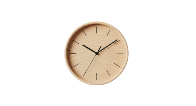 A minimalist oak wood frame wall clock showcasing a clean white face with sleek black hands perfect for modern interiors simple elegant on transparent background