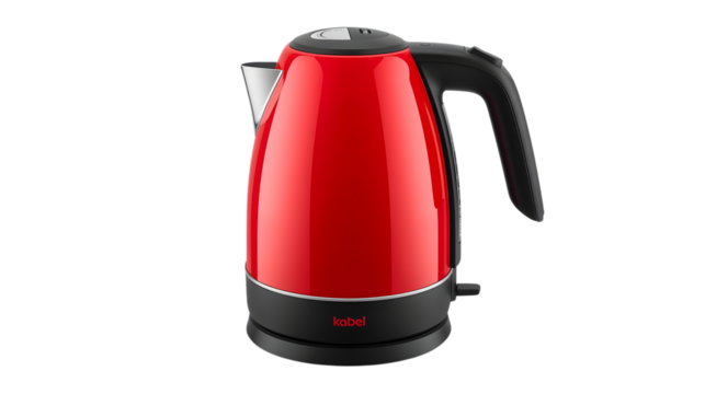 Red electric kettle with black handle and base in modern minimalist design on white background for kitchen appliances advertising