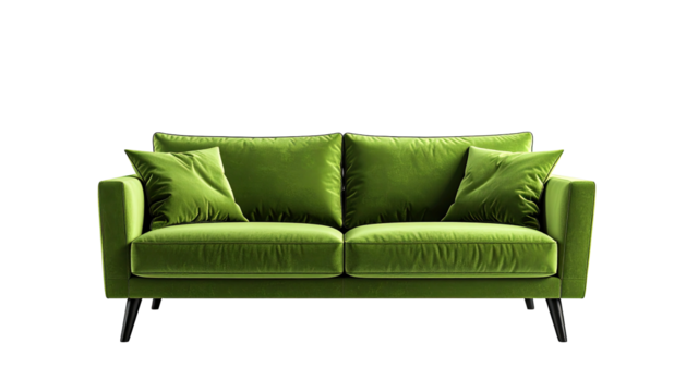 A vibrant, emerald green sofa with matching pillows, isolated against a stark black background