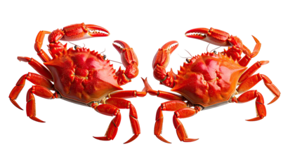 Two vibrant orange and black crab claws, isolated on a white background, showcasing their detailed texture and sharp pincers.