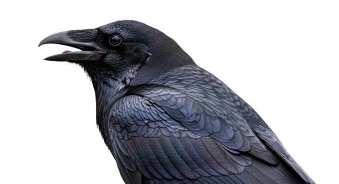 High-resolution image of a crow with wings slightly spread, isolated on a transparent background, perfect for graphic design and artistic projects.