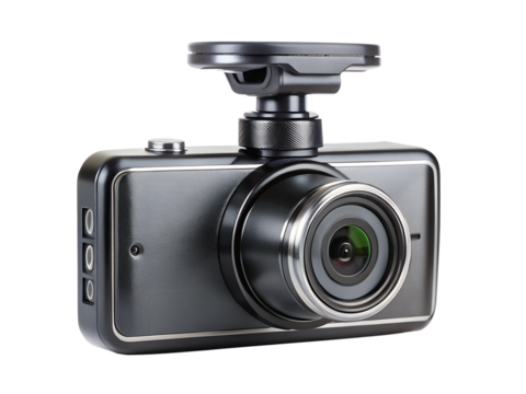 Modern automotive dash cam with a textured black casing and a prominent lens isolated on transparent background