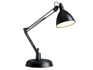 Black desk lamp with adjustable arm, perfect for workspace lighting, isolated on white background.