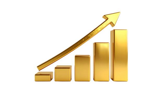 Golden bar graph with ascending arrow, representing growth on a black backdrop