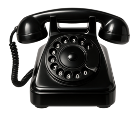 Vintage black rotary telephone isolated on transparent background in studio shot