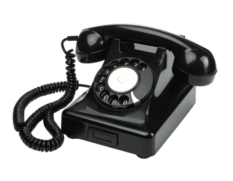 Vintage black rotary dial telephone isolated on PNG white transparent background.