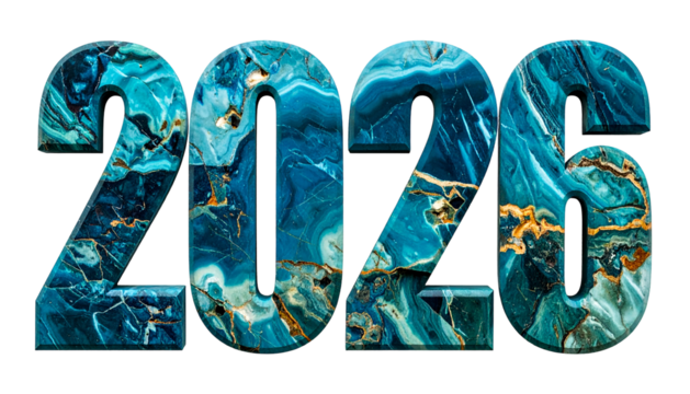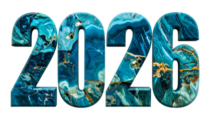 Frosted numbers "2026" with internal bubbles, isolated on black background