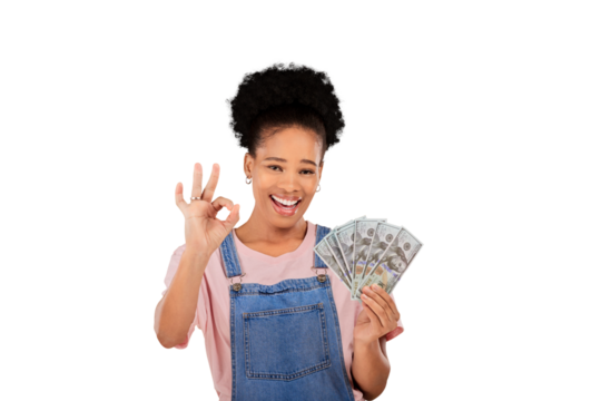Ok, happy woman and winner in portrait for money, bonus or lottery for cash prize. Black person, smile and hand gesture on isolated or transparent png background with dollar, investing or competition