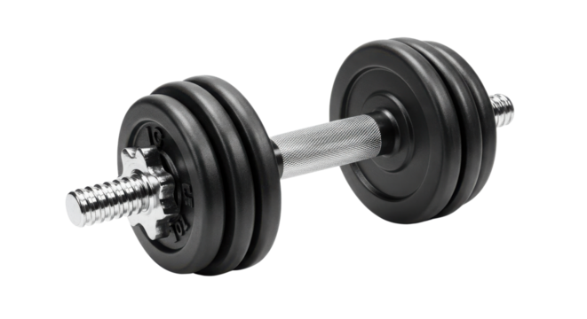 A single black dumbbell with multiple plates isolated on a black background in a studio shotisolated on transparent background