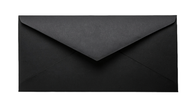 Closed black envelope on transparent background representing mystery and elegance