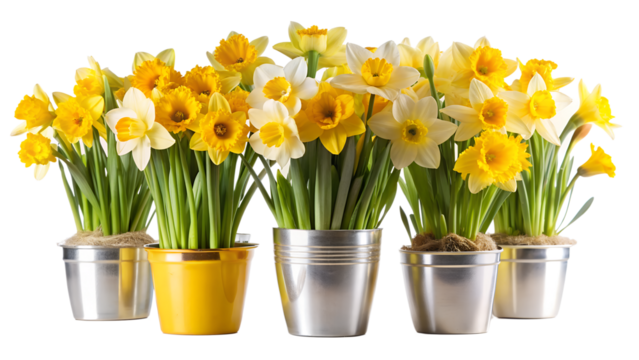 five pots containing blooming daffodils. The pots are arranged in one row on a white background