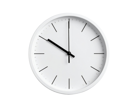 Analog wall clock with light wooden frame, white dial, and bold black numerals hands