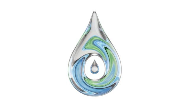 A stylized shiny metallic water drop icon filled with swirling blue and green liquid on black.