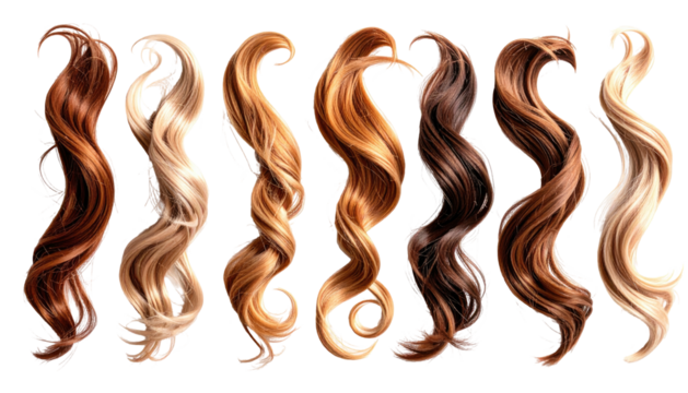 Assorted locks of hair in varying shades against a black background